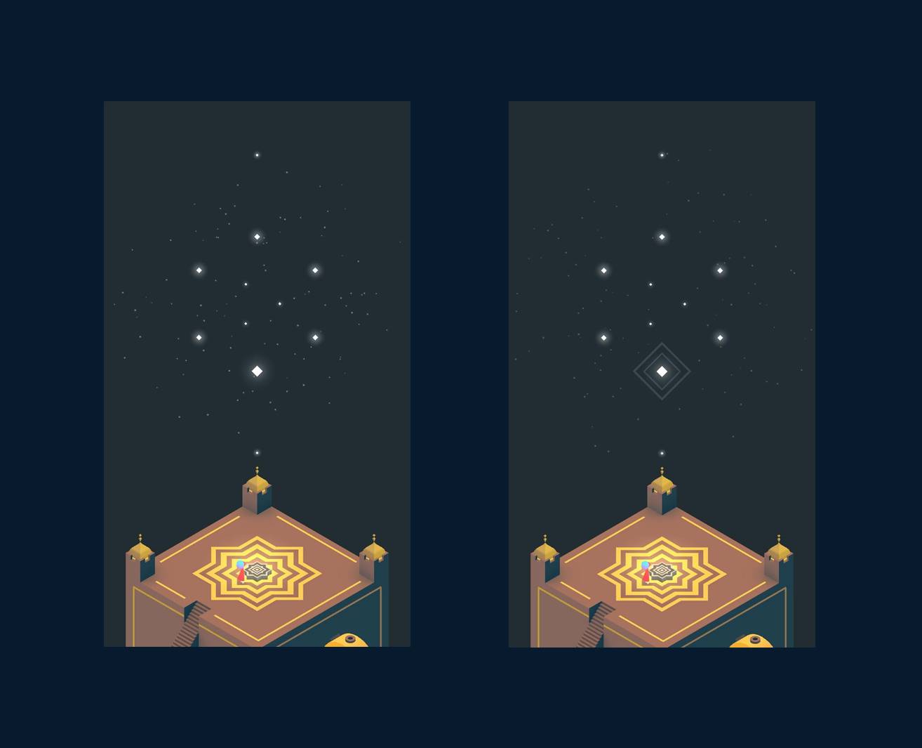 在纪念碑谷每一关结束时,都会鼓励玩家连接星星来创建“曼陀罗”符号。玩家第一次进入这个画面时,望着眼前的景致却不知道该怎么做。当玩家尝试着轻轻点击星星,发现夜空中的星星变得越来越亮,周身闪烁着耀眼的光芒,会不会突然意识到可以连接星星来创建符号?✨