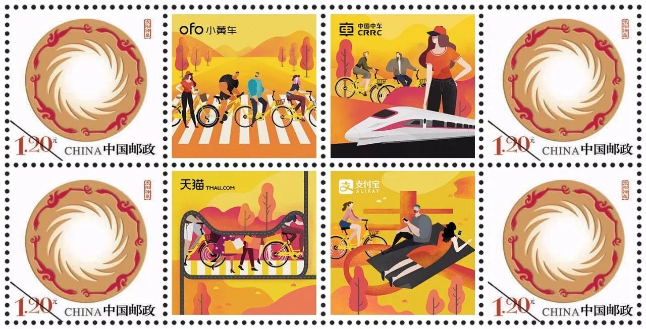 这套邮票由ofo联合中车、支付宝和天猫共同推出,一经发布就形成了刷屏的节奏。