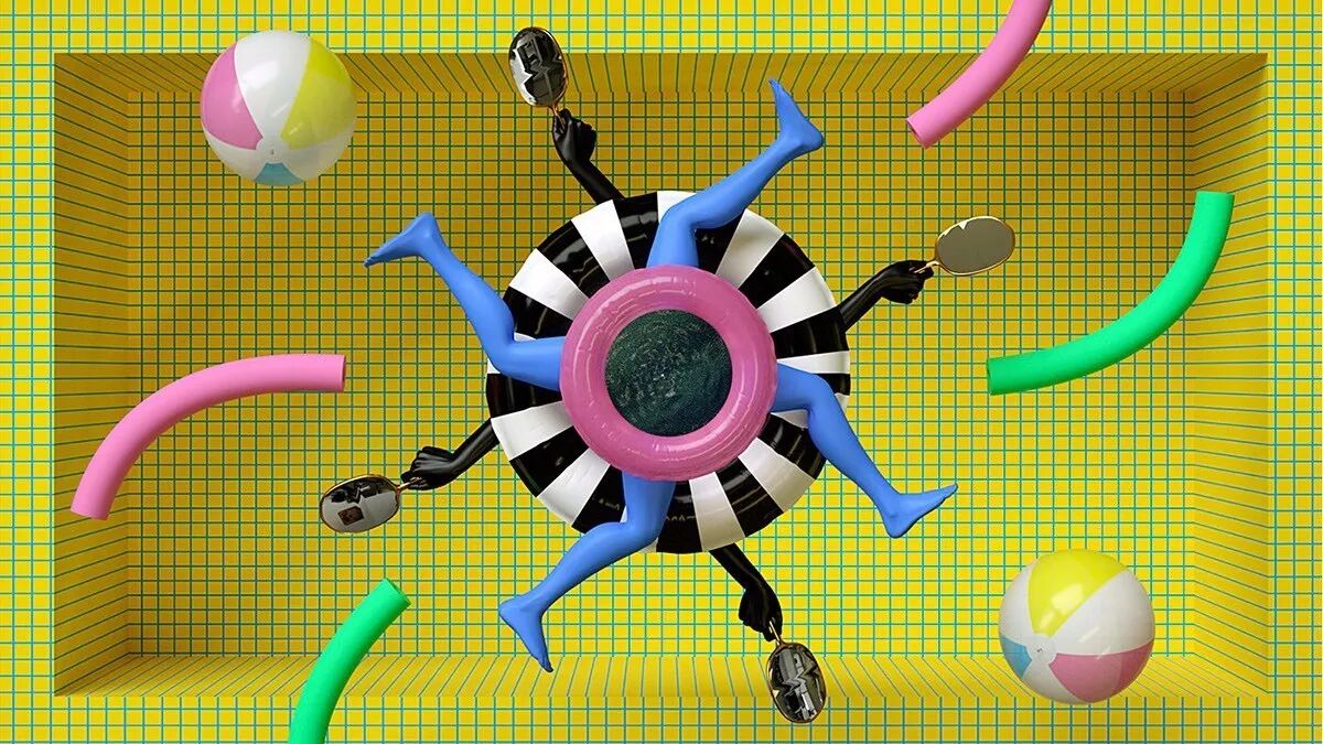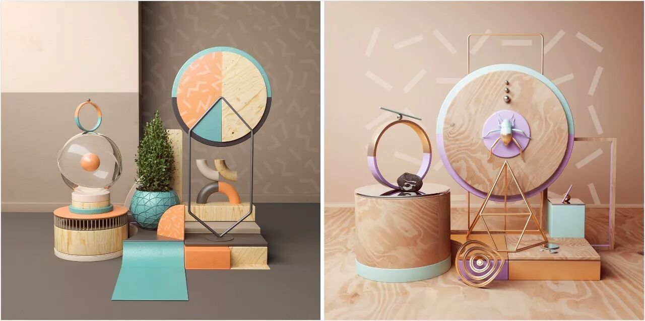 孟菲斯风格在构图上也不愿意遵循“横平竖直”的线条规则,运用点线面的几何图案,各种波浪、曲面和直线、平面3D构图的组合,简直是玩脱了