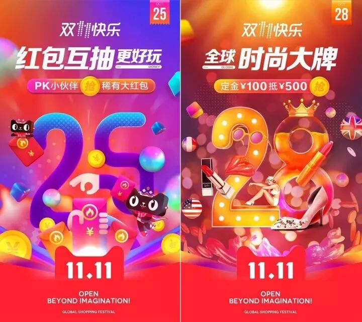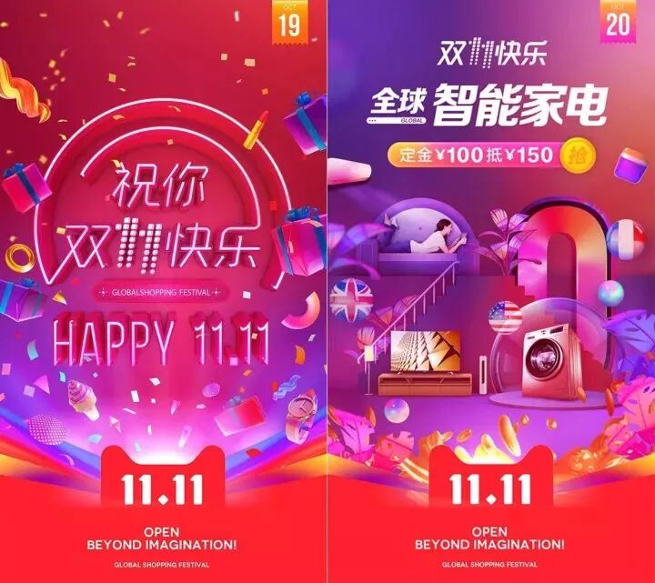 在双十一的狂欢背后,积累了设计师数不清的修改和反复的筛选,最终找到最合适的元素和设计风格。才能创造出这些打动人心的海报,才能在第一眼强烈地吸引我们,勾起内心的购买欲望。