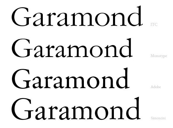 Adobe就聪明地根据法国字体师Claude Garamond原始铸模设计而成,Monotype和Simoncini则是根据Jean Jannon刻板设计,尊重历史,在字体界具有崇高的地位。